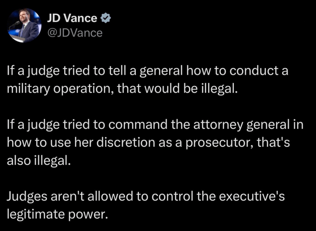 Elon Musk, acting for Trump, has triggered the crisis that will break America. Many people were relieved when the courts issued temporary restraining orders (TRO) to halt the illegal work of DOGE. But for Trump, this is exactly what he needed. The TRO, and any subsequent court orders, are the lever he needs to finally, and fully, remove the executive branch from constitutional control. This morning, both Elon and VP Vance have said that the courts have no power over the executive. They simply don’t recognize the Article III branch of government. What is most frightening is that they may have the power to ignore all court orders. How does that happen?