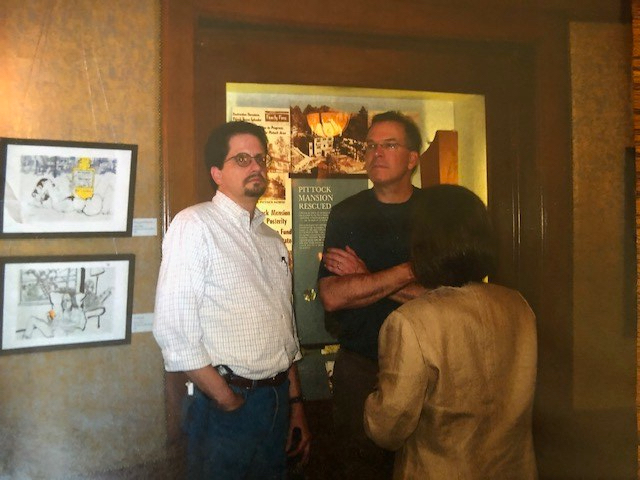 The picture. It was late. Nick had been invited to the opening of a new exhibit at Pittock Mansion. As his Parks guy, I went with him. We got an amazing tour of the things the public don’t see, hidden doors, third floor rooms, the basement cast iron elevator motor. We viewed the exhibit, and as always happened, people sort of lined-up to talk to the commissioner. Pittock had their own photographer. I went to extricate Nick. The woman in the picture would not take a clue. When they sent me all the pictures to pick the ones we wanted, I said, “And print me a copy of this one.” This picture still makes me laugh because it is so damn honest. I framed it for my home office.